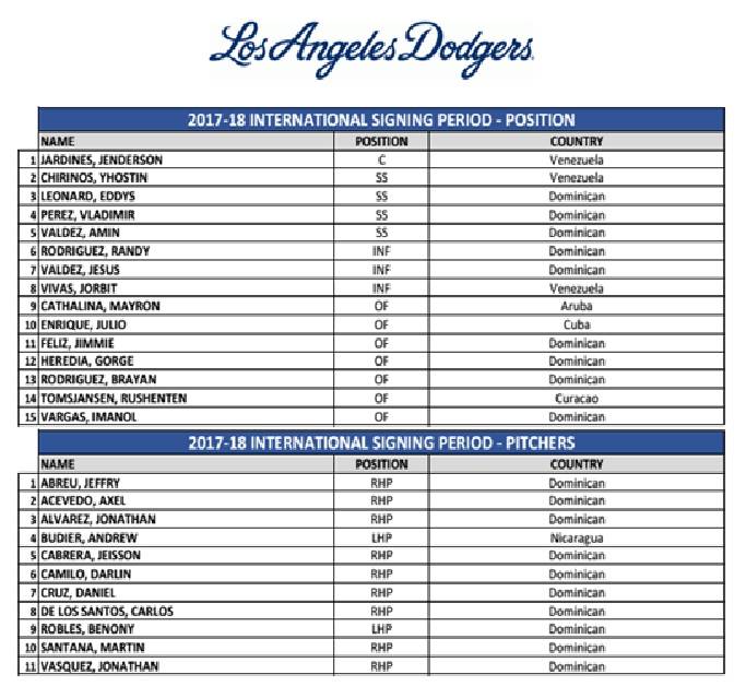 DODGERS ANNOUNCE SIGNINGS OF INTERNATIONAL PROSPECTS