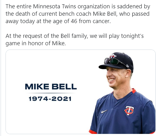 Mike Bell, a member of one of the most storied baseball families, who was a third-generation player and coach (Twins) died at at 46 of kidney cancer. The Twins put out this press release: