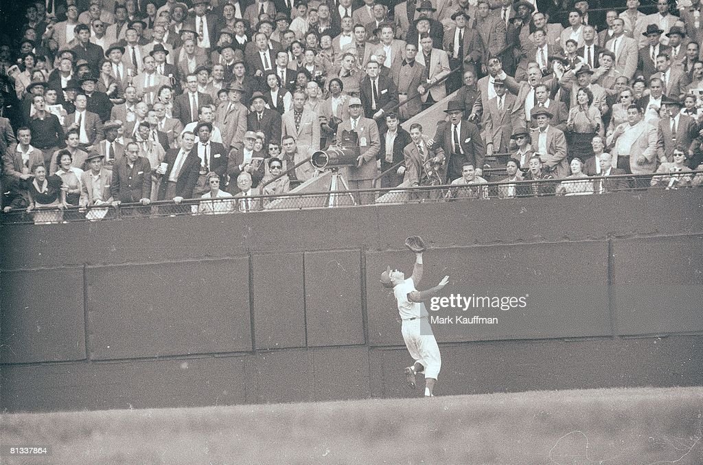 In the fifth inning of game 2 of the series, Willie Mays hit a fly ball that was in between Mantle and DiMaggio. It looked as though the two would collide then Mantle heard DiMaggio say “I got it“. Mantle stopped short from a full sprint and in doing so, caught his spikes on the rubber cover of a drainpipe and dropped to the ground. DiMaggio bent over and asked if he was alright, then said don’t move, they are bringing a stretcher.