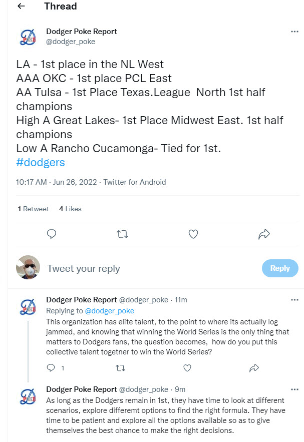 The Keyword is don’t panic! Don’t make a dope-fiend move. Bobby Miller, Ryan Pepiot, and or Gavin Stone may not be relievers, but they could be for a partial season. Those three could be throwing some filth out of the bullpen shortly. I hear about trading for all these relievers… Keep doing that Stupid Stuff and you have to keep doing that Stupid Stuff. Grow your own, you silly geese! The Dodger’s deep farms system can fuel plugging the holes internally rather than trade prospects for a guy who was good last year or last week.