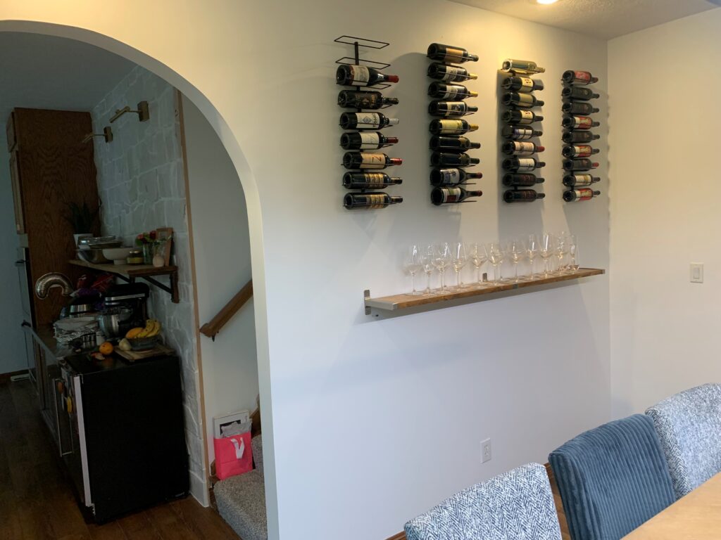 ,,, and her “wine art” wall – I swear I had nothing to do with taking the two missing bottles (hic):