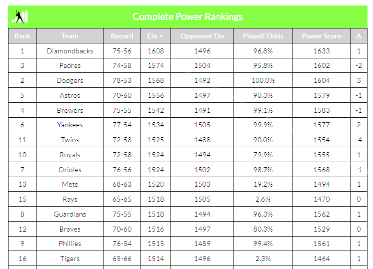 This season, we’ve revamped our power rankings. The old model wasn’t very reactive to the ups and downs of any given team’s performance throughout the season, and by September, it was giving far too much weight to a team’s full body of work without taking into account how the club had changed, improved, or declined since March. That’s why we’ve decided to build our power rankings model using a modified Elo rating system. If you’re familiar with chess rankings or FiveThirtyEight’s defunct sports section, you’ll know that Elo is an elegant solution that measures teams’ relative strength and is very reactive to recent performance.