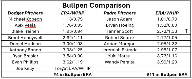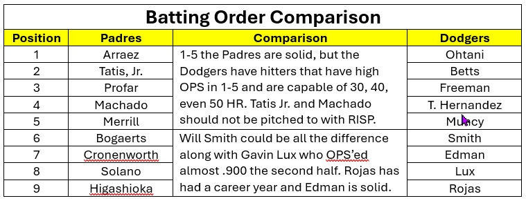 The Dodgers have a better offense, defense, and bullpen (by a slight margin). The Padres have better starting pitching, but overall the pitching is close. The Dodgers will need to win on offense, defense and the bullpen. Names to watch: Rojas, Lux, Kelly, Teo, Muncy! Mookie, Freddie, and Shohei are the keys… as they go, so will the Dodgers.