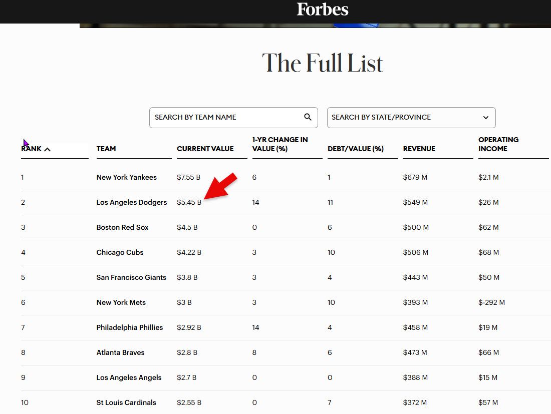 The Dodger’s value seems low especially what they’ve done in the Japanese market with Ohtoni. I believe next year’s value willl be much higher as revenues contain to climb and we hopefully compete and win another World Series.