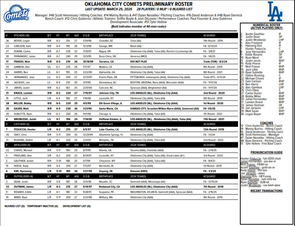 With an unusual Sunday offday for the Dodgers today,Bobby Miller is on the mound for Oklahoma City today making his first start since being hit in the head early in Spring training.The game is 3:05PM ET.