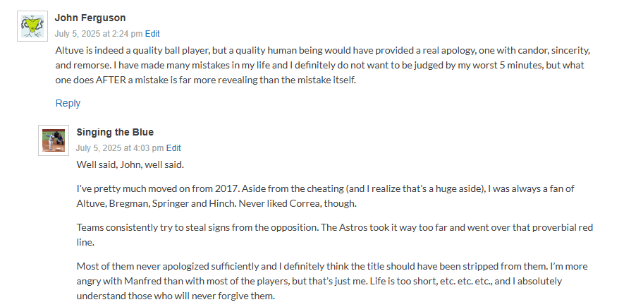 Most of them never apologized sufficiently and I definitely think the title should have been stripped from them. I’m more angry with Manfred than with most of the players, but that’s just me. Life is too short, etc. etc. etc., and I absolutely understand those who will never forgive them.