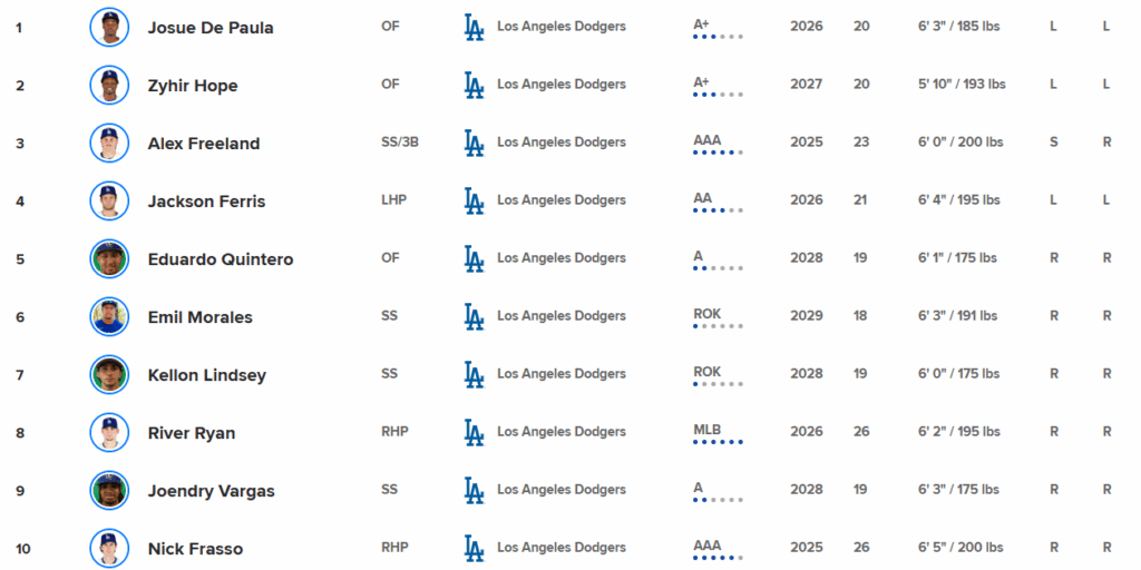 The Dodgers could bring up Alex Freeland later in the season, but not just now. He has to be on the 40-Man Roster, and currently, he is not! Emmet Sheehan is due back today. Tyler Glassnow is due back this week. Blake Snell, probably after the All-Star Game, and Roki Sasaki is due back… “whenever” (his development could actually be delayed until 2026). Josue De Paula and Zyhir Hope have been selected to participate in the 2025 All-Star Futures Game. The game is at Truist Park in Atlanta, Georgia, on Saturday, July 12th at 4:00 pm ET. Major League Baseball, in conjunction with MLB Pipeline and Baseball America, handled the selection process.