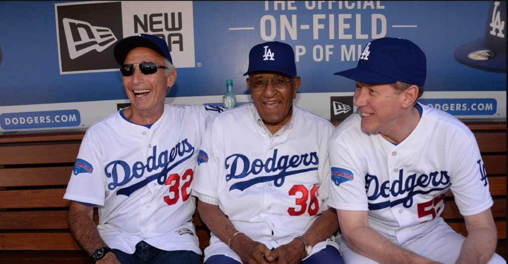 Players are sitting, Furillo, Koufax, Pafko, Gilliam, Neal, Erskine, Carey and Babe Herman Second row. Campy, umpire Al Passarella, Ump, Jocko Conlon, Ump, Beans Reardon, Shuba, Wills, Larker, Tracewski, Roseboro, Stengel, Moon, Craig, Demeter, Skowron, Dixie Walker, Roebuck. Back row. Pignatano, Hodges, Ump Pat Orr, Lavagetto, Maglie, Podres, Newcombe, Hermanski, Sherry, Reese, Drysdale, Burright, Essegian, Black, Snider, Branca. Those were the first oldtimers to get together and play a game…
